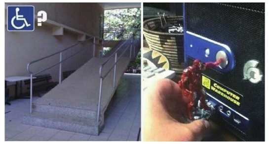 圖1-6是2幅網(wǎng)絡(luò)上流傳的照片,左圖的通道是為了殘障人士而設(shè)計(jì)的嗎? 看樣子好像是,又好像不是,讓人匪夷所思。右圖是鋼鐵俠造型的U盤(pán),外觀(guān)很酷是不是? 但是使用的時(shí)候好像出了點(diǎn)問(wèn)題。鋼鐵俠的手緊緊地按住了關(guān)機(jī)鍵,且手臂不能自由活動(dòng) 。