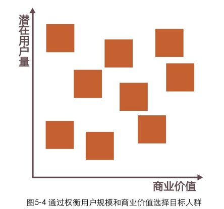 該選擇哪種類型作為產(chǎn)品的目標(biāo)用戶,需要綜合權(quán)衡用戶對公司的價值以及潛在需求量。別忘了,平衡商業(yè)價值和用戶需求本來就是設(shè)計師需要特別關(guān)注到的。在一個坐標(biāo)平面上對潛在用戶進行分布羅列,坐標(biāo)平面的2個坐標(biāo)軸分別是潛在用戶量和商業(yè)價值 (包含對推廣、營銷成本的考慮),如圖5-4所示。我們優(yōu)先考慮最右上角那些潛在用戶量大和商業(yè)價值大 (推廣成本低) 的用戶。因為要同時考慮到產(chǎn)品利益和用戶需求,所以這項工作最好由產(chǎn)品經(jīng)理和設(shè)計師配合完成。