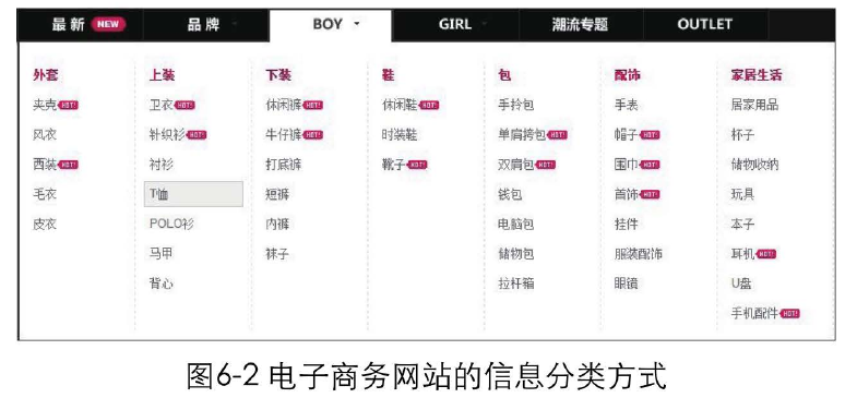 比如,在生活中,要買(mǎi)一件男士T恤,會(huì)首先找到商場(chǎng)賣(mài)男裝的樓層,再找到店鋪中擺放上衣的區(qū)域去挑選 恤。在電子商務(wù)網(wǎng)站對(duì)商品進(jìn)行組織時(shí),同樣采用了這種 “男裝>上裝>T恤" 的分類(lèi)方式,如圖6-2所示。如果分類(lèi)方式改成 "上裝>男裝>T恤",你會(huì)不會(huì)覺(jué)得怪怪的呢? 不符合邏輯習(xí)慣的分類(lèi)很容易把用戶(hù)弄糊涂 。