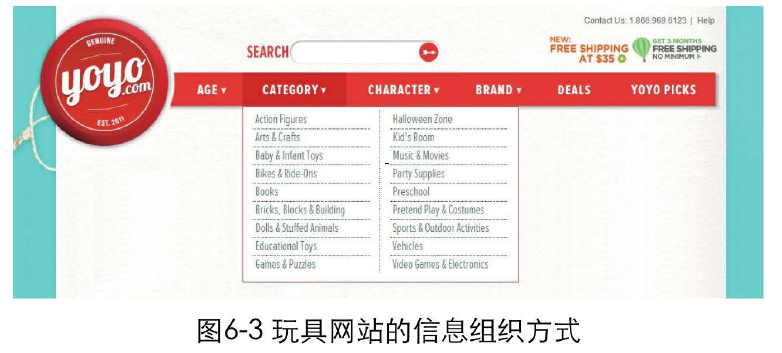 比如,一個(gè)玩具網(wǎng)站可以從適用年齡、玩具類(lèi)別、特點(diǎn)、品牌幾個(gè)方面,對(duì)玩具進(jìn)行組織分類(lèi),如圖6-3所示。