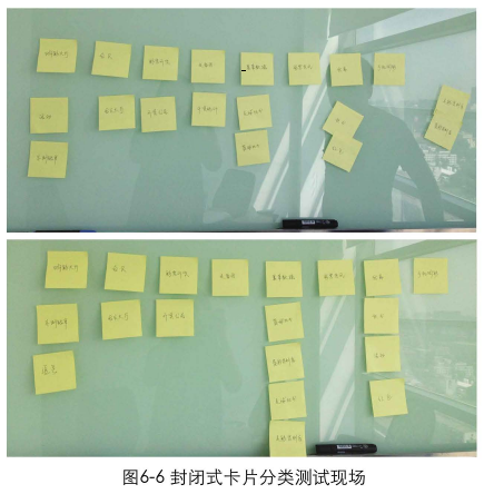 封閉式: 網(wǎng)站制作設(shè)計(jì)師首先會(huì)將導(dǎo)航的架構(gòu)設(shè)計(jì)好,確定出導(dǎo)航的個(gè)數(shù)和名稱(chēng),再將屬于這些類(lèi)目的卡片分發(fā)給用戶(hù),讓用戶(hù)根據(jù)自己的期望,把卡片歸類(lèi)在不同的導(dǎo)航分類(lèi)下。如果有些卡片用戶(hù)不知道該將它分到哪個(gè)類(lèi)目下,可以將它拿出來(lái),所有卡片不一定要全部分完。封閉式的分類(lèi)更利于掌控,可以用于對(duì)信息設(shè)計(jì)的結(jié)果進(jìn)行驗(yàn)證的階段,如圖6-5.圖6-6所示。