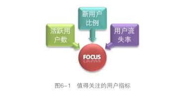從上面可以看出,我們在獲得訪問用戶數(shù)、新用戶數(shù)、活躍用戶數(shù)、流失用戶數(shù)、回訪用戶數(shù)的同時,通過計(jì)算還得到了老用戶數(shù)、留存用戶數(shù)等衍生用戶指標(biāo),同時得到了新用戶比例、活躍用戶比例、用戶流失率、用戶訪問率等復(fù)合指標(biāo)。這些指標(biāo)給我們的分析提供了足夠的支持,而且指標(biāo)的定義相對明確,有各自的應(yīng)用價值,不會存在相互重復(fù)或重疊的部分,類似這樣的網(wǎng)站用戶指標(biāo)體系是比較完整和規(guī)范的。至于上面提到的其他用戶指標(biāo),也許在某些時候基于某些分析才會用到,一般不需要作為 日常指標(biāo),可以使用臨時統(tǒng)計(jì)或者從其他數(shù)據(jù)中間接獲取。 當(dāng)我們已經(jīng)定義了一套適合分析用戶的指標(biāo)體系之后,可以看一下哪些指標(biāo)值得重點(diǎn)去關(guān)注,這個時候可以設(shè)想一下 : 如果你想用盡量簡潔有效的數(shù)據(jù)了解一個網(wǎng)站或產(chǎn)品的用戶情況, 你會問哪幾個用戶數(shù)據(jù)? 如果是我提問,我只會問三個指標(biāo):活躍用戶數(shù)、新用戶比例和用戶流失率,如圖6-1所示。