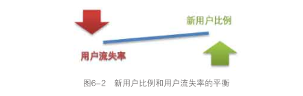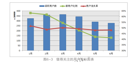 網(wǎng)站的活躍用戶數(shù)體現(xiàn)了網(wǎng)站制作當(dāng)前實(shí)際掌握的用戶數(shù)量,結(jié)合新用戶比例和用戶流失率可以分析網(wǎng)站用戶的發(fā)展情況,通過這三個指標(biāo)基本可以掌控網(wǎng)站用戶的全景。可以將這三個指標(biāo)放在一張圖表中來分析網(wǎng)站用戶的狀況,如圖6-3所示。