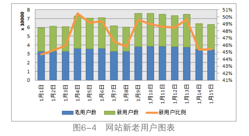 如圖6-4所示,可以用柱狀堆積圖顯示新用戶和老用戶的數(shù)量變化,堆積的結(jié)果就是網(wǎng)站總用戶數(shù)量的變化,結(jié)合新用戶比例的折線,通過分析網(wǎng)站新用戶的數(shù)量和比例的變化能夠直接反映網(wǎng)站在營銷推廣上的效果。