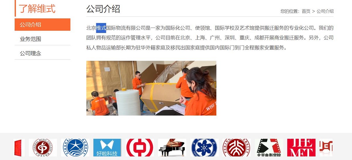 北京維式國(guó)際物流有限公司是一家為國(guó)際化公司、使領(lǐng)館、國(guó)際學(xué)校及藝術(shù)館提供搬遷服務(wù)的專(zhuān)業(yè)化公司。我們的團(tuán)隊(duì)擁有規(guī)范的運(yùn)作管理水平,公司目前在北京、上海、廣州、深圳、重慶、成都開(kāi)展商業(yè)搬遷服務(wù)。另外,公司私人物品運(yùn)輸部長(zhǎng)期為駐華外籍家庭及移民出國(guó)家庭提供國(guó)內(nèi)國(guó)際門(mén)到門(mén)全程搬家安置服務(wù)。