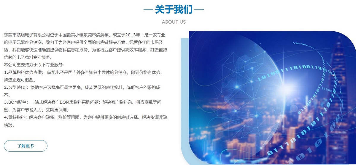東莞市航旭電子有限公司位于中國最美小鎮(zhèn)東莞市清溪鎮(zhèn),成立于2013年,是一家專業(yè)的電子元器件分銷商,致力于為各客戶提供全面的供應鏈解決方案,憑著多年的市場經(jīng)驗,我們能夠快速準確的提供物料信息和報價,為各行業(yè)客戶提供高效率服務,打造值得信賴的電子物料專業(yè)服務。