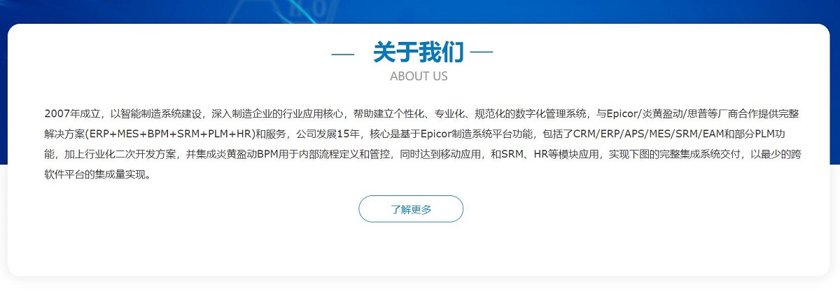 2007年成立,以智能制造系統(tǒng)建設(shè),深入制造企業(yè)的行業(yè)應(yīng)用核心,幫助建立個性化、專業(yè)化、規(guī)范化的數(shù)字化管理系統(tǒng),與Epicor/炎黃盈動/思普等廠商合作提供完整解決方案(ERP+MES+BPM+SRM+PLM+HR)和服務(wù),公司發(fā)展15年,核心是基于Epicor制造系統(tǒng)平臺功能,包括了CRM/ERP/APS/MES/SRM/EAM和部分PLM功能,加上行業(yè)化二次開發(fā)方案,并集成炎黃盈動BPM用于內(nèi)部流程定義和管控,同時達(dá)到移動應(yīng)用,和SRM、HR等模塊應(yīng)用,實現(xiàn)下圖的完整集成系統(tǒng)交付,以最少的跨軟件平臺的集成量實現(xiàn)。