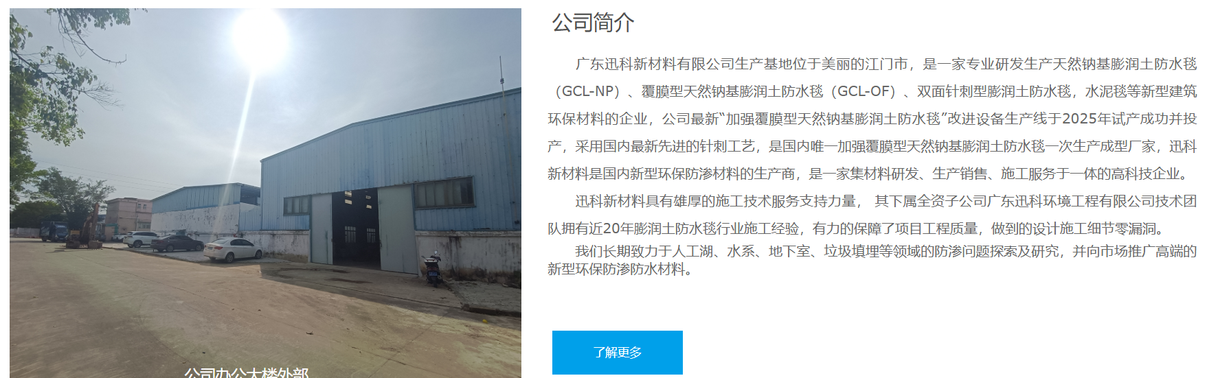 廣東迅科新材料有限公司生產(chǎn)基地位于美麗的江門市,是一家專業(yè)研發(fā)生產(chǎn)天然鈉基膨潤土防水毯(GCL-NP)、覆膜型天然鈉基膨潤土防水毯(GCL-OF)、雙面針刺型膨潤土防水毯,水泥毯等新型建筑環(huán)保材料的企業(yè),公司最新“加強覆膜型天然鈉基膨潤土防水毯”改進設(shè)備生產(chǎn)線于2025年試產(chǎn)成功并投產(chǎn),采用國內(nèi)最新先進的針刺工藝,是國內(nèi)唯一加強覆膜型天然鈉基膨潤土防水毯一次生產(chǎn)成型廠家,迅科新材料是國內(nèi)新型環(huán)保防滲材料的生產(chǎn)商,是一家集材料研發(fā)、生產(chǎn)銷售、施工服務(wù)于一體的高科技企業(yè)。