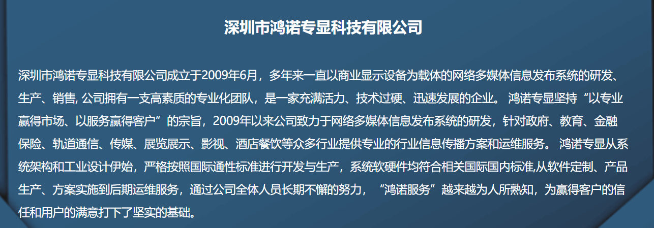深圳市鴻諾專(zhuān)顯科技有限公司成立于2009年6月,多年來(lái)一直以商業(yè)顯示設(shè)備為載體的網(wǎng)絡(luò)多媒體信息發(fā)布系統(tǒng)的研發(fā)、生產(chǎn)、銷(xiāo)售, 公司擁有一支高素質(zhì)的專(zhuān)業(yè)化團(tuán)隊(duì),是一家充滿(mǎn)活力、技術(shù)過(guò)硬、迅速發(fā)展的企業(yè)。