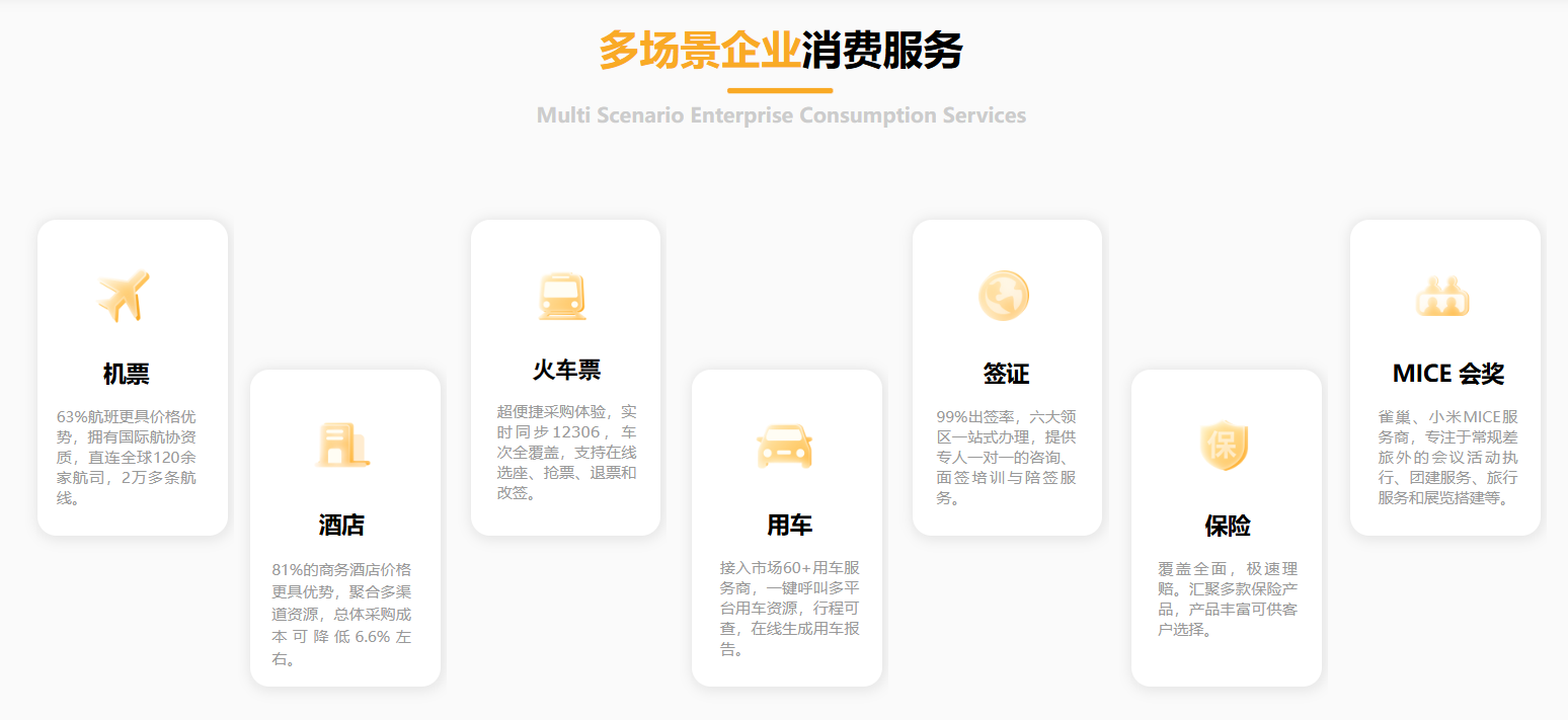 圍繞企事業(yè)單位因公出行的機票、酒店、用車、火車票、用餐等場景,聚合相應(yīng)產(chǎn)業(yè)供應(yīng)鏈,將創(chuàng)新的費控技術(shù)與業(yè)務(wù)應(yīng)用深度融合,助力企業(yè)數(shù)字化升級,降本提效。