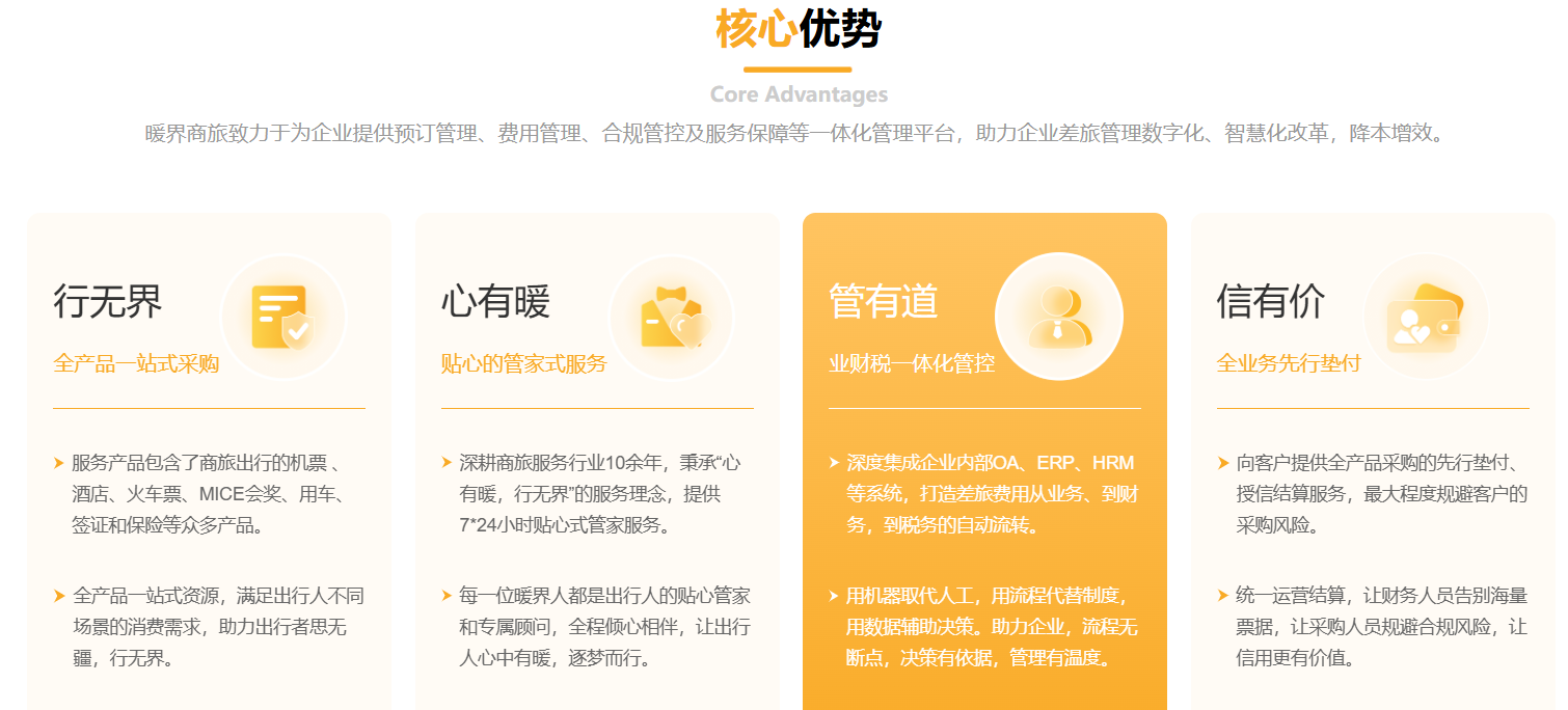 2009年成立,公司全稱為北京暖界商務(wù)服務(wù)有限公司,隸屬于暖界科技集團(tuán),以為企事業(yè)單位提供差旅集采的定制化管控解決方案為核心業(yè)務(wù)。
