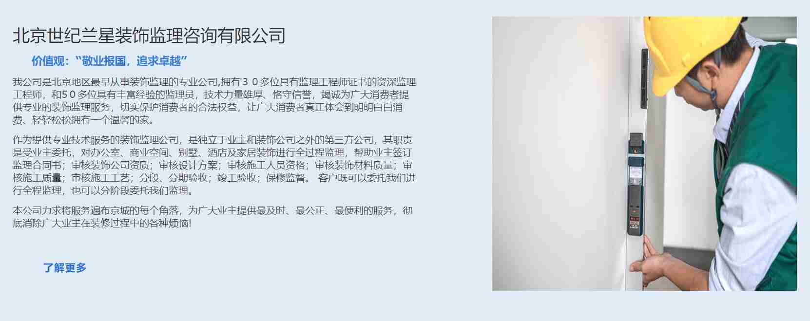 北京世紀(jì)蘭星裝飾監(jiān)理咨詢有限公司是一家專門從事室內(nèi)外裝飾裝修監(jiān)理的第三方監(jiān)理公司。成立于2005年,總部設(shè)在北京。 北京世紀(jì)蘭星裝飾監(jiān)理咨詢有限公司是獨(dú)立的第三方監(jiān)理咨詢公司,已經(jīng)成為北京規(guī)模較大、服務(wù)范圍最全的專業(yè)的裝飾監(jiān)理公司,全體員工本著為客戶創(chuàng)建100%滿意服務(wù)的專業(yè)精神,高效地服務(wù)于我們的所有客戶群。 全部監(jiān)理人員上崗前都須經(jīng)過企業(yè)文化培訓(xùn)、職業(yè)道德培訓(xùn)、專業(yè)技能培訓(xùn),他們尊重和維護(hù)自己的同時,善待每一位業(yè)主。他們的言行感動著我們每一位業(yè)主也贏得了業(yè)主的尊重和贊揚(yáng),他們成為了企業(yè)文化的基石。