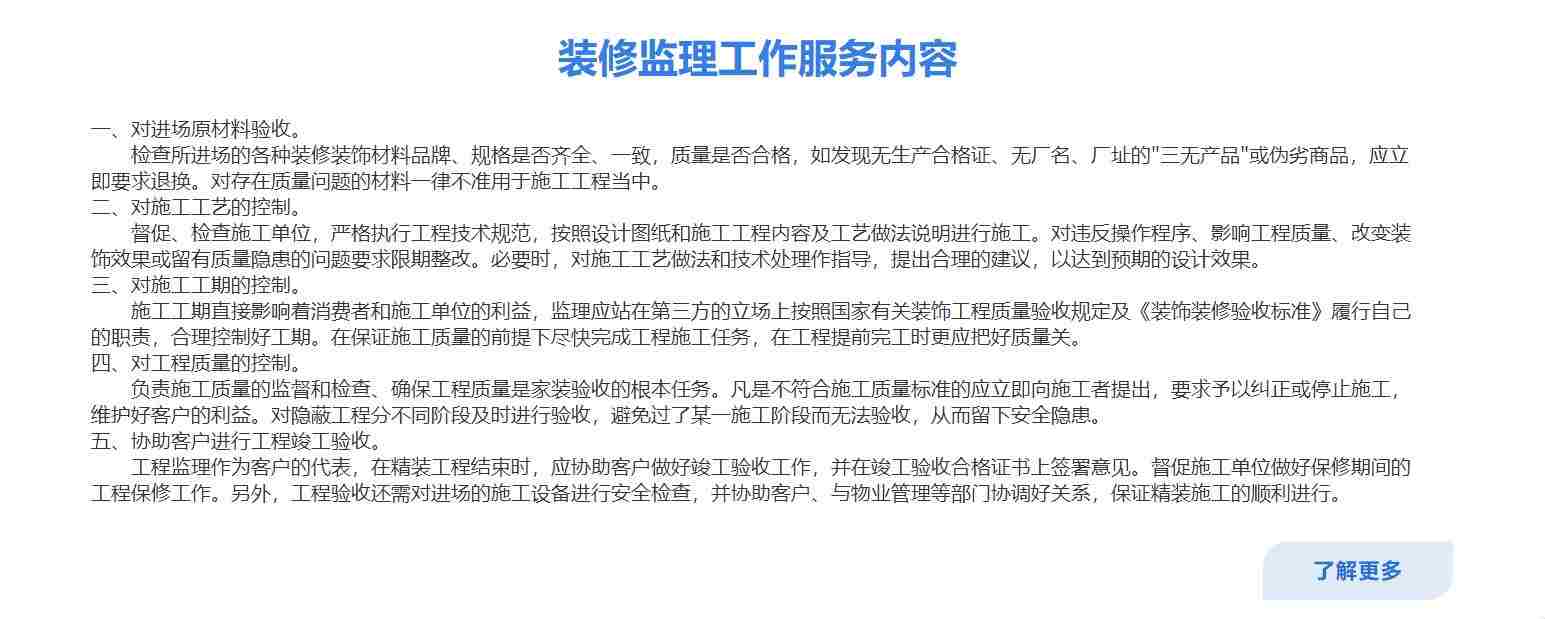 公司秉承銳意進(jìn)取的企業(yè)文化,不拘泥于現(xiàn)有監(jiān)理行業(yè)的服務(wù)形式,在工作中不斷求新求變,開辟現(xiàn)代監(jiān)理裝修解決方案的新思路、新服務(wù),引領(lǐng)現(xiàn)代生活方式的新潮流,以創(chuàng)新獨(dú)到的方式全面優(yōu)化生活和環(huán)境質(zhì)量。公司將秉持“誠懇、踏實(shí)、專業(yè)+用心服務(wù)”的理念,讓您更加省心、放心、安心。