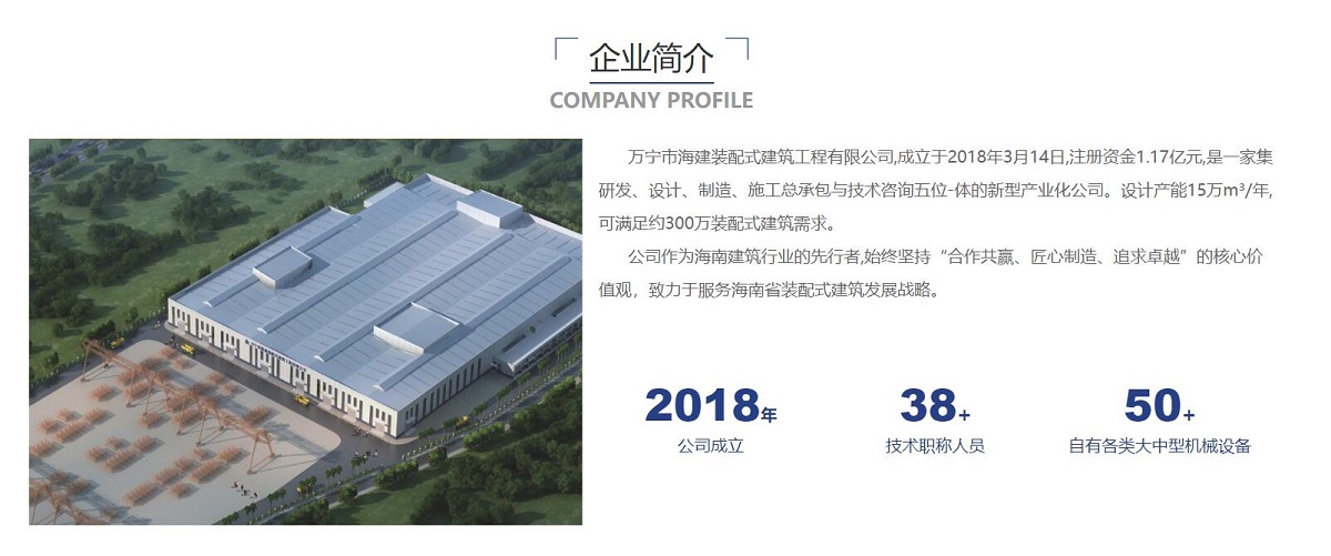 萬寧市海建裝配式建筑工程有限公司,成立于2018年3月14日,注冊資金1.17億元,是一家集研發(fā)、設(shè)計、制造、施工總承包與技術(shù)咨詢五位-體的新型產(chǎn)業(yè)化公司。設(shè)計產(chǎn)能15萬m³/年,可滿足約300萬裝配式建筑需求。