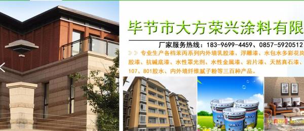 畢節(jié)市*興涂料有限公司位于貴州省畢節(jié)市奢香故里,企業(yè)創(chuàng)始團隊從事該行業(yè)三十年,有實力雄厚的施工隊伍,技術力量強,是集科研、開發(fā)、制造為一體的現(xiàn)代化綜合型企業(yè)。畢節(jié)市榮興涂料有限公司專業(yè)生產(chǎn)各檔苯丙系列內(nèi)外墻乳膠漆、浮雕漆、炮水多彩花崗巖、彈性乳膠漆、抗堿底漆、水性罩光劑、水性金屬漆、漆、天然真石漆、防水涂料、107. 801膠水、內(nèi)外墻纖維膩子粉等三百種產(chǎn)品,價格親民,產(chǎn)品齊全,具有耐磨、抗老化、防水、抗污,附著力極強等功能,綠色環(huán)保,節(jié)省涂料。
