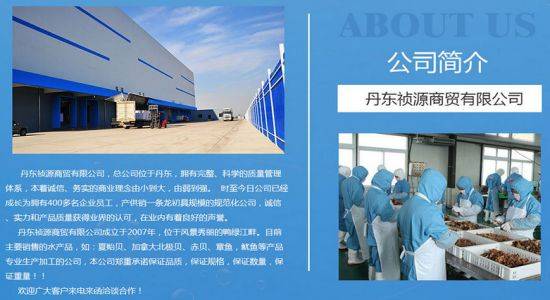 丹東禎源商貿(mào)有限公司,總公司位于丹東,擁有完整、科學(xué)的質(zhì)量管理體系,本著誠信、務(wù)實(shí)的商業(yè)理念由小到大,由弱到強(qiáng)。 時(shí)至今日公司已經(jīng)成長為擁有400多名企業(yè)員工,產(chǎn)供銷一條龍初具規(guī)模的規(guī)范化公司,誠信、實(shí)力和產(chǎn)品質(zhì)量獲得業(yè)界的認(rèn)可,在業(yè)內(nèi)有著良好的聲譽(yù)。 丹東禎源商貿(mào)有限公司成立于2007年,位于風(fēng)景秀麗的鴨綠江畔。目前主要銷售的水產(chǎn)品,如:夏貽貝、加拿大北極貝、赤貝、章魚,魷魚等產(chǎn)品專業(yè)生產(chǎn)加工的公司,本公司鄭重承諾保證品質(zhì),保證規(guī)格,保證數(shù)量,保證重量!公司主要經(jīng)營:銷售:家用電器、針紡織品、服裝鞋帽、工藝美術(shù)品、建筑裝飾材料、日用百貨、化工產(chǎn)品(不含危險(xiǎn)品)、五金交電、礦產(chǎn)品、農(nóng)畜產(chǎn)品、水產(chǎn)品、飼料、箱包、食品、酒、飲料;服裝加工;收購農(nóng)畜產(chǎn)品;貨物及技術(shù)進(jìn)出口。