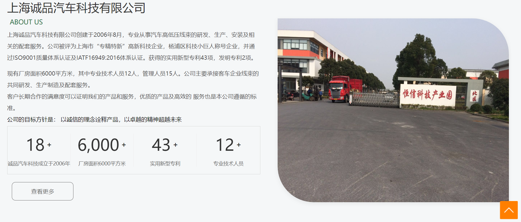 上海誠品汽車科技有限公司創(chuàng)建于2006年8月,專業(yè)從事汽車高低壓線束的研發(fā)、生產(chǎn)、安裝及相關的配套服務。公司被評為上海市“專精特新”高新科技企業(yè),楊浦區(qū)科技小巨人稱號企業(yè),并通過ISO9001質(zhì)量體系認證及IATF16949:2016體系認證。獲得的實用新型專利43項,發(fā)明專利2項。