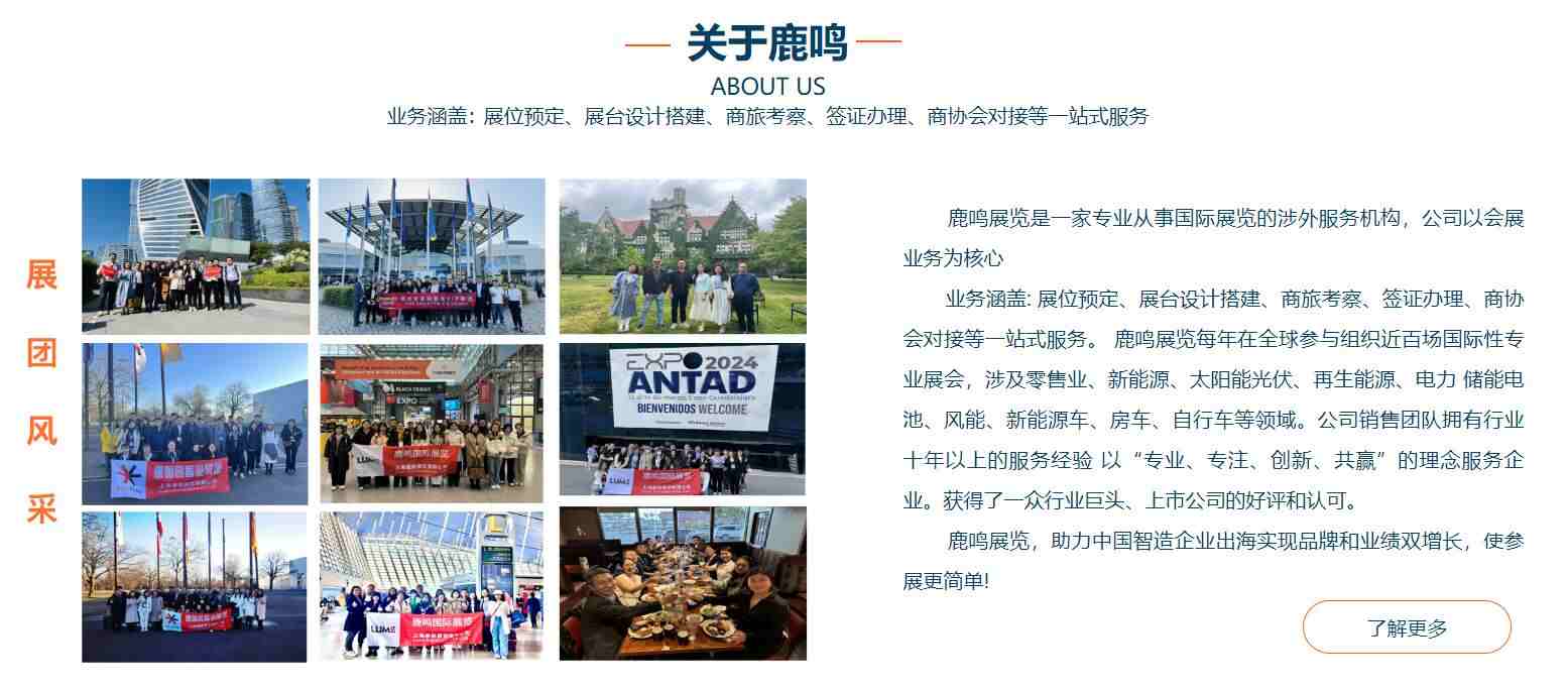 鹿鳴展覽是一家專業(yè)從事國際展覽的涉外服務(wù)機(jī)構(gòu),公司以會展業(yè)務(wù)為核心,業(yè)務(wù)涵蓋:展位預(yù)定、展臺設(shè)計搭建、商旅考察、簽證辦理、商協(xié)會對接等一站式服務(wù)。 鹿鳴展覽每年在全球參與組織近百場國際性專業(yè)展會,涉及零售業(yè)、包裝、光伏太陽能、儲能、電池、充電樁、可再生能源等領(lǐng)域。公司銷售團(tuán)隊擁有行業(yè)十年以上的服務(wù)經(jīng)驗,以“專業(yè)、專注、負(fù)責(zé)任”的理念服務(wù)企業(yè),獲得了一眾行業(yè)巨頭、上市公司的好評和認(rèn)可。 鹿鳴展覽,專業(yè)助力企業(yè)拓展全球市場!