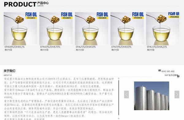 榮成愛*斯海洋生物科技有限公司選用我司企業(yè)食品行業(yè)的網(wǎng)站優(yōu)化產(chǎn)品,其SEO關(guān)鍵詞有 魚油,精制魚油,多烯魚油,榮成魚油,山東魚油。其特點是用很合適的展示方式、展示效果、站點框架,把客戶及其用戶很關(guān)心的問題突出表現(xiàn);并以簡潔明朗的設(shè)計風(fēng)格,清晰展現(xiàn)公司水平實力,確保一秒抓住目標(biāo)用戶眼球,給用戶留下良好的第一印象。榮成愛*斯海洋生物科技有限公司成立于2009年,是經(jīng)榮成市市場監(jiān)督管理局審核的有資質(zhì)的公司,其統(tǒng)一社會信用代碼:9137108268**437216。公司地址:山東省威海市榮成市石島工業(yè)園龍騰北路109號。